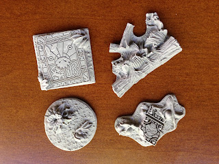 Four large resin pieces are included for bigger bases. These include a large log with a skeleton wrapped in spider webs, two pieces of Lizardmen ruins and a boring 40mm round base with a fly trap plant and Space Marine helmet.